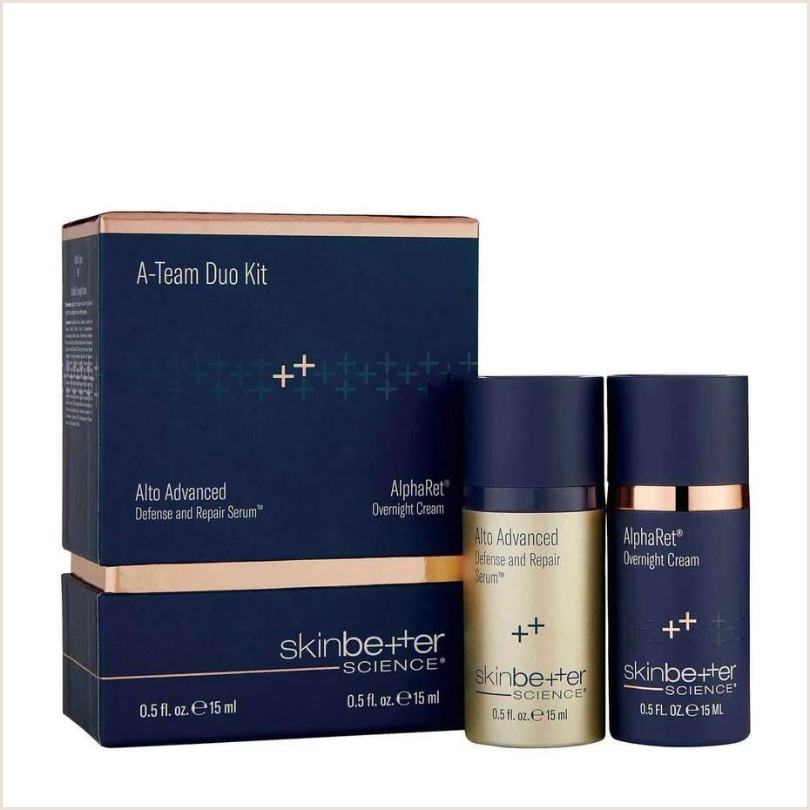 The A-Team Duo Kit combines two powerful products: Alto Advanced Defense and Repair Serum and AlphaRet Overnight Cream. Together, they provide antioxidant protection during the day and skin renewal at night, targeting the signs of aging and improving overall skin tone and texture.